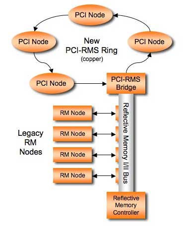 The PCI-RMS Bridge provides a path between COMPRO’s Reflective Memory System (RMS) and the PCI-RMS Ring. The Bridge allows either RMS I or RMS II transfers to propagate to PCI-RMS Nodes and PCI-RMS Node transfers to flow onto RMS I or RMS II Bus. The Bridge provides a method for connecting Nodes to an existing RMS Bus using "state of the art" computing systems. This capability offers a seamless, non-intrusive mechanism to augment Legacy systems with powerful new features using today's computing solutions. By adding PCI-RMS nodes, the architecture can easily expand into a tightly coupled "super-system", cooperatively working on the most challenging applications.